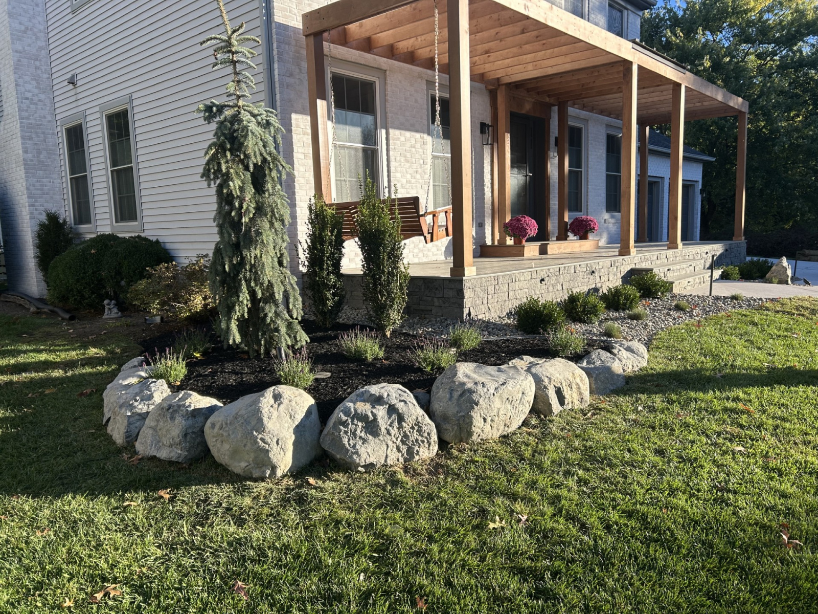 The project presented a few challenges that needed careful planning. A new concrete walkway had created a steep elevation change and potential water runoff issues. Our hardscaping work addressed this head-on. We installed a pop-up drain to effectively manage drainage and built a small boulder wall to raise the grade, creating a much smoother and more attractive transition. To bridge the final gap between the new walkway and the existing front lawn, we installed new sod, ensuring a seamless and healthy lawn.