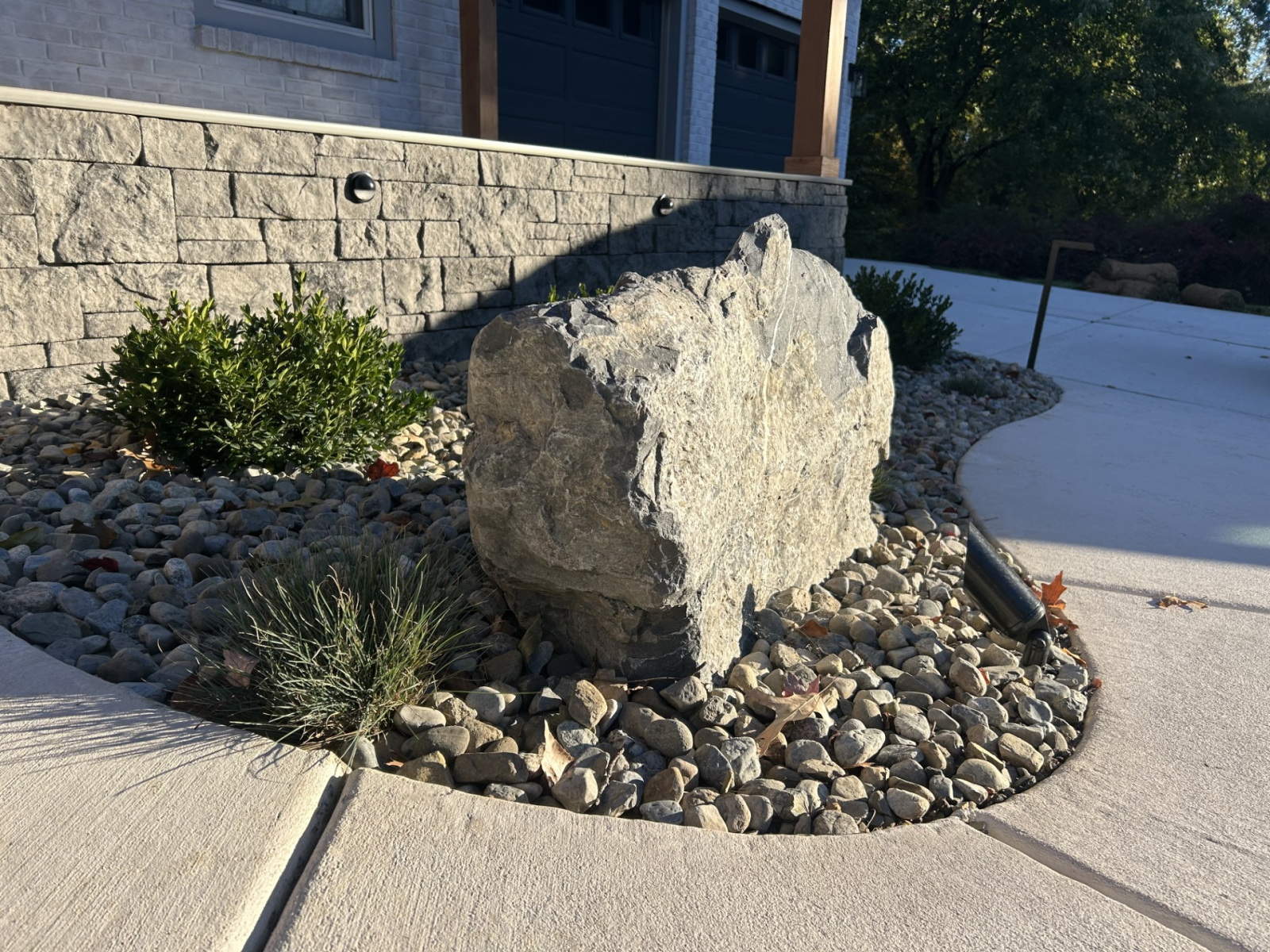 With the foundational hardscaping in place, we focused on the plantings and lighting. We designed and installed foundation plantings with a mix of evergreens for year-round structure and seasonal plants to add pops of color. A unique feature of this project was a specific boulder we sourced and installed, chosen for its shape and style, to allow for an address plaque to be mounted directly on it. To complete the vision, we installed a landscape lighting package. This included bullet lights to uplight the address boulder and a beautiful columnar evergreen that serves as a focal point, as well as pathway lights to safely illuminate the front walkway after dark.