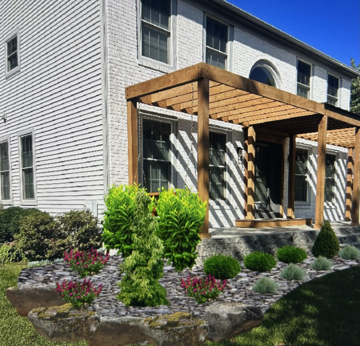 Our latest project showcases the beautiful results of combining professional landscaping & hardscaping in West Deptford, NJ, for the Lamparelli family in the Pennfield development. We were thrilled to partner with them to put the finishing touches on their recently updated home. After giving their house a facelift with a new front porch, painted brick, and a modern pergola, they needed a landscape design that would tie everything together and truly make their house a home.